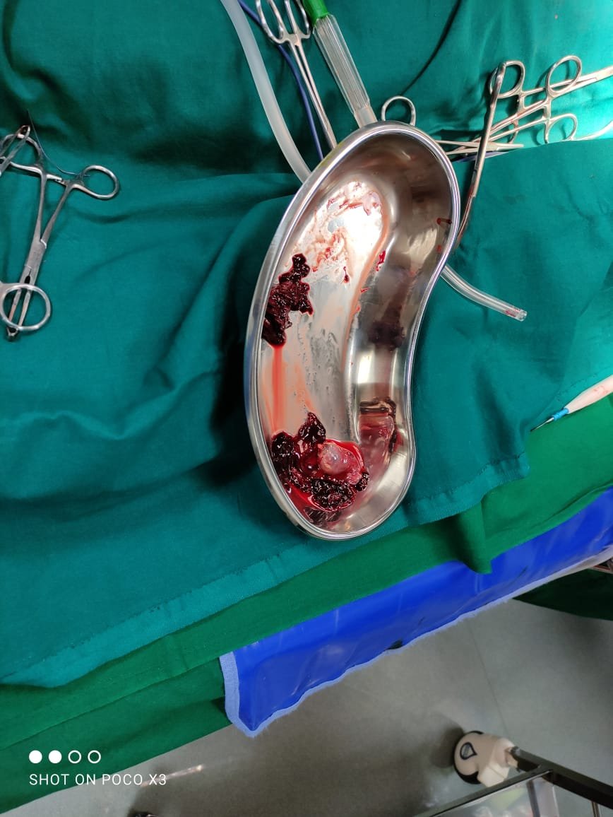URINE GRAVINDEX WAS DONE WITH SUSPICION FOR TEN DAYS OF AMENORRHEA PRECEDING THIS CYCLE – FOUND POSITIVE AND ULTRASOUND SCAN DONE SHOWED ECHOGENIC MASS 4 * 4 CM LEFT ADNEXA, FREE FLUID + BETA HCG – 5550 Iu/ml. PATIENT WAS PALE WITH HB – 6.8 gm/L. LAPAROTOMY DONE WITH ONE UNIT OF PACKED CELL DONE AT 1.00PM AND SHOWED HEMOPERITONEUM WITH 100 ML OF BLOOD STAINED FLUID ,PELVIC HEMATOCELE – 200gm OF CLOTS, LEFT AMPULLARY PREGNANCY – 4×4 cm. LEFT SALPINGECTOMY DONE AND CLOTS REMOVED, PREITONEAL WASH DONE.SPECIMEN SENT FOR HISTO PATHOLOGY . BLOOD TRANFUSIONS WAS DONE. POSTOPERATIVE PERIOD UNENENTFUL AND PATIENT WAS DISCHARGE ON D3.